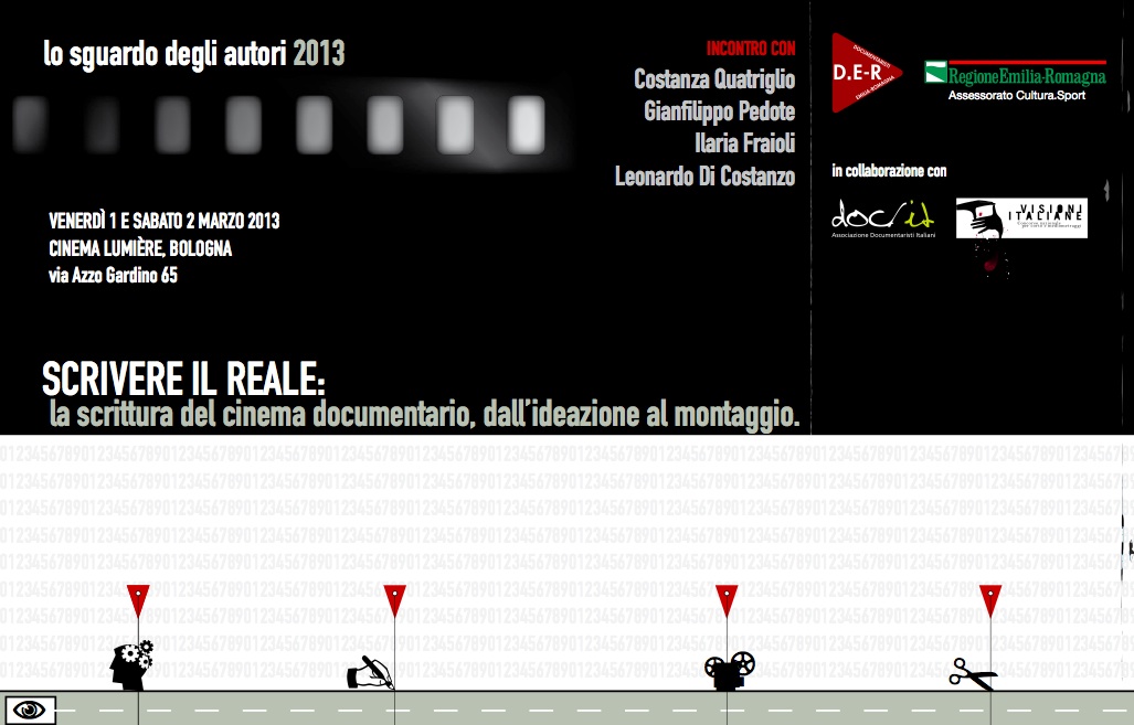 Si terrà l’1 e il 2 marzo, la sesta edizione de ‘Lo sguardo degli autori’, uno dei rari spazi di riflessione sul cinema documentario italiano realizzato da D.E-R – Documentaristi Emilia Romagna, con il sostegno dell’Assessorato alla cultura della Regione Emilia Romagna e in collaborazione con Doc/it, all’interno del Festival Visioni italiane. Protagonisti della sesta edizione saranno Costanza Quatriglio (regista del recente Terramatta), Gianfilippo Pedote (produttore di Vogliamo anche le rose e Noi non siamo come James Bond), Ilaria Fraioli (montatrice di Un’ora sola ti vorrei e dei recenti Nadea e Sveta e Tutto parla di te), e Leonardo Di Costanzo (regista e scrittore di film documentari e di finzione, tra gli ultimi L’intervallo e Cadenza d’inganno) che si confronteranno sullo strumento più importante e più sottovalutato del cinema documentario: la scrittura. Durante la due giorni saranno proiettati spezzoni delle opere degli autori invitati.