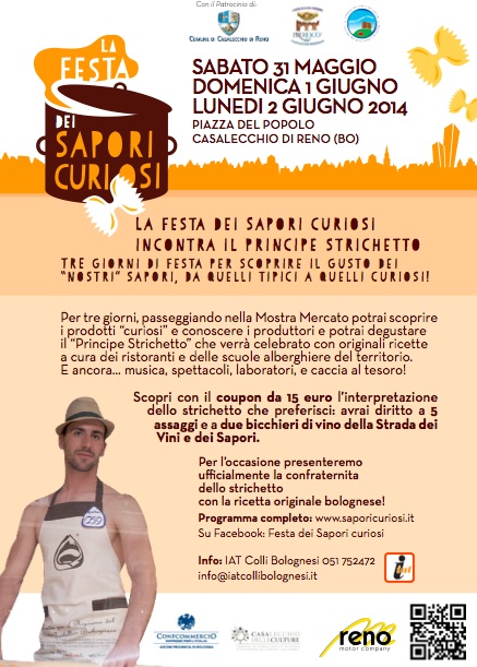 La 3^ festa dei Sapori Curiosi a Casalecchio di Reno incontra lo Strichetto. Dopo aver “rilanciato” il Tortellino nella precedente edizione, quest’anno il protagonista della manifestazione sarà il “principe Strichetto”. Per l’occasione verrà presentata la neo Confraternita dello Strichetto, che in collaborazione con l’Accademia Italiana della Cucina ha preparato la ricetta originale bolognese che verrà depositata presso la Camera di Commercio di Bologna così come è già stato fatto per molti piatti tipici nostrani. E’ un modo per vivacizzare e rilanciare tutti prodotti eno-gastronomici bolognesi e il suo forte indotto che va dai ristoratori, alle sfogline e alle industrie di macchine automatiche.