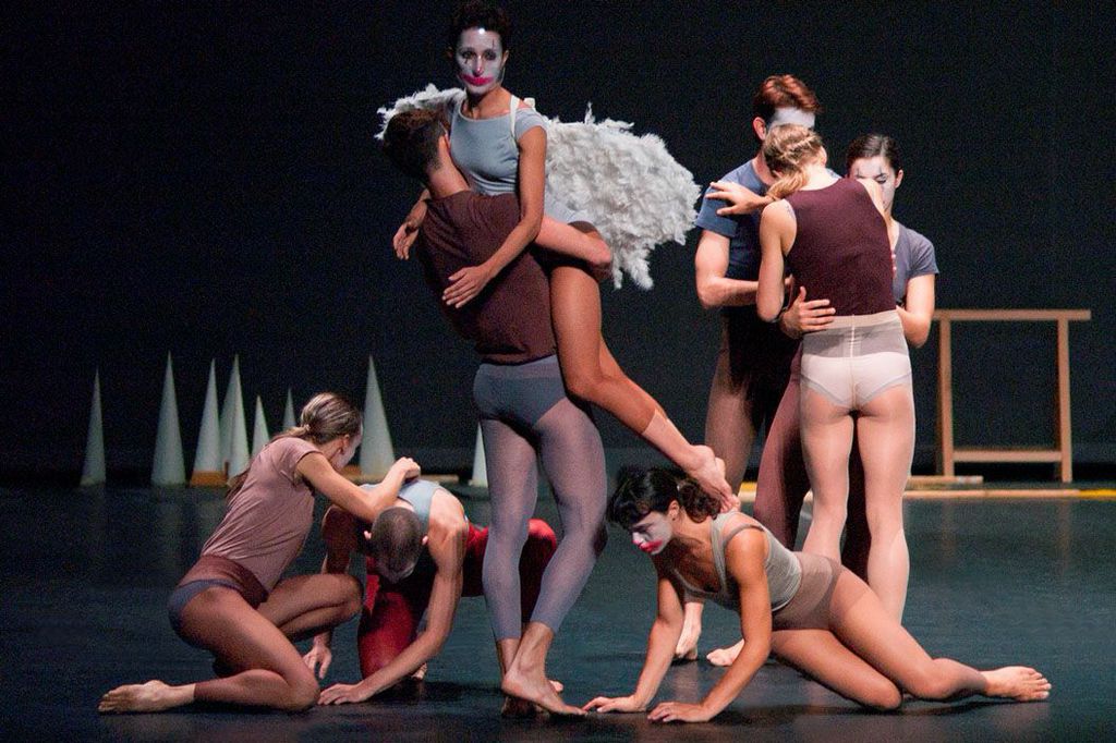 I cinque quadri che compongono lo spettacolo, Annuncio, Crocifissione, Deposizione, Sepoltura, Resurrezione, attraversano i volti sbiancati dei danzatori, le bocche sfumate dal rosso delle labbra, lo sguardo sgomento. Così le cinque parti coreografiche si presentano come altrettanti appunti, sopralluoghi nel territorio della storia e nello spazio dell’oggi: annunciano il desiderio di appartenere a un corpo risorgendo al gesto ed evaporando in un continuo inarrestabile di figure.