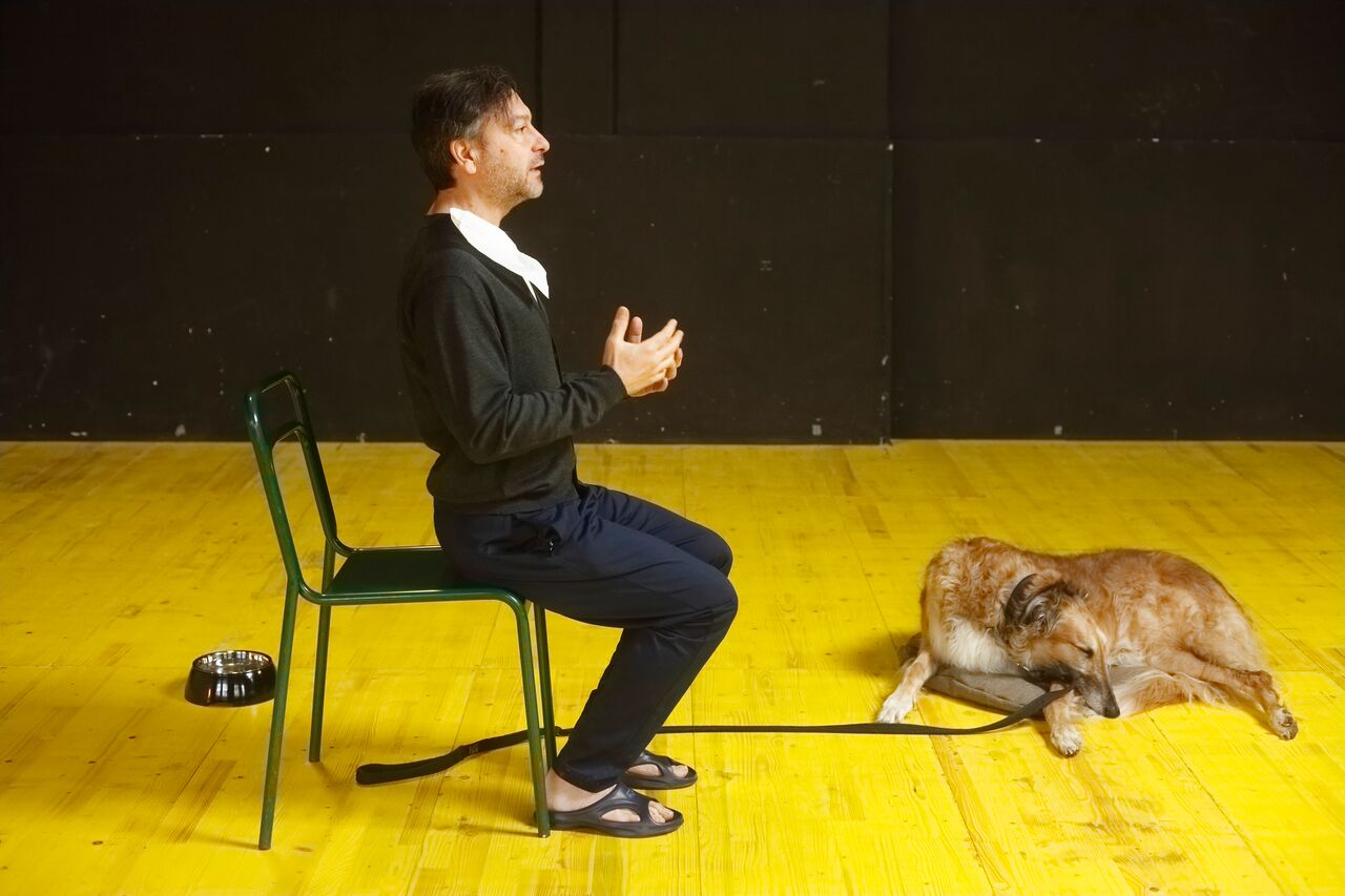 Sul palcoscenico, oltre a Musio, un cane, “il migliore amico dell’uomo”: presenza in ascolto, occhi che ci osservano; quasi un superstite che in silenzio asseconda quel bisogno di ascolto, di comunicare che cosa significhi essere attori. L’interprete cerca con esso una scintilla creativa che lo aiuti a spiegare al pubblico in che cosa consiste l’arte del teatro, come si costruisce la relazione con uno spettatore nel momento stesso in cui la si pronuncia con tutto il corpo.