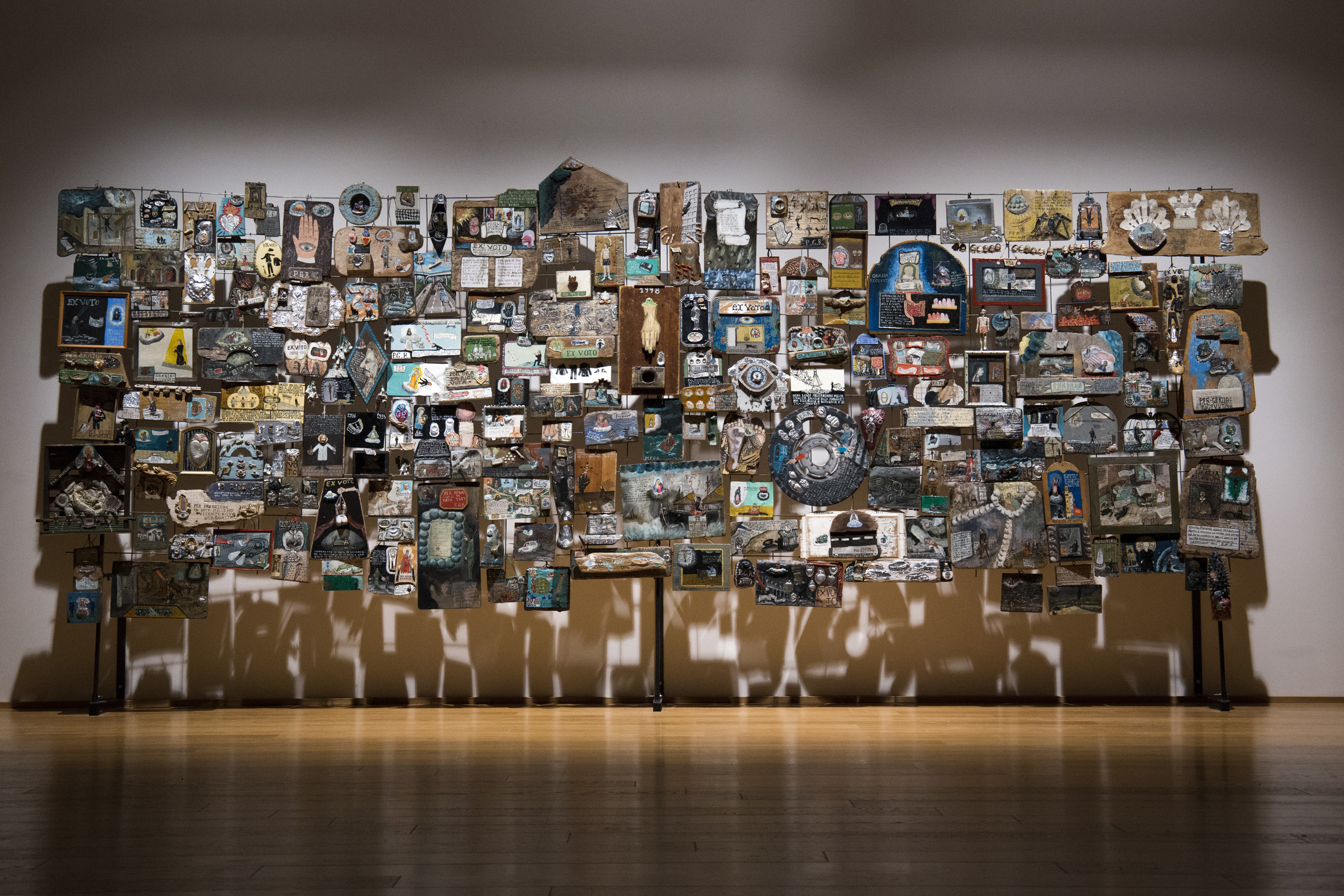 Le singole tavolette, secondo le parole dello stesso Maurizio Finotto realizzate in maniera “mistica e ossessiva”, in gran parte con frammenti di legno recuperati dal mare e lavorate con materiali poveri in diverse tecniche, riprendono iconografie e modalità testuali tipiche delle tradizioni popolari della fede cristiana, disvelando eventi drammatici o imbarazzanti che hanno fortemente condizionato l’esistenza dell’autore. Allestite con la densità espositiva tipica delle usanze tradizionali nei luoghi di culto, le opere narrano per immagini l’infanzia dell’artista, l’abbandono del paese natale nella provincia veneta e di un lavoro sicuro per intraprendere gli studi artistici a Bologna, le alterne fortune di una carriera tortuosa, gli incidenti, gli insuccessi e i traguardi raggiunti nella professione e nella vita privata.