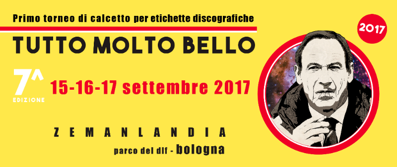 Riparte Tutto Molto Bello, il torneo di calcetto per etichette discografiche e operatori del settore musicale organizzato da Sfera Cubica, Modernista e Locomotiv Club. L’appuntamento è fissato per il 15, 16 e 17 settembre negli spazi del Parco del Dopolavoro Ferroviario di Bologna (campi da calcetto, Arena Puccini e Locomotiv Club), che per l’occasione in quei giorni diventerà Zemanlandia, in onore dell’allenatore boemo omaggiato nel logo di questa VII edizione.