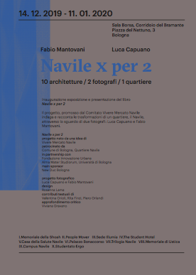 Il progetto fotografico, promosso dal Comitato Vivere Mercato Navile, con il contributo del Comune di Bologna e la partnership di Fondazione per l’Innovazione Urbana e Alma Mater Studiorum – Università di Bologna, indaga e racconta le trasformazioni di un quartiere, il Navile, attraverso lo sguardo di due fotografi: Luca Capuano e Fabio Mantovani.