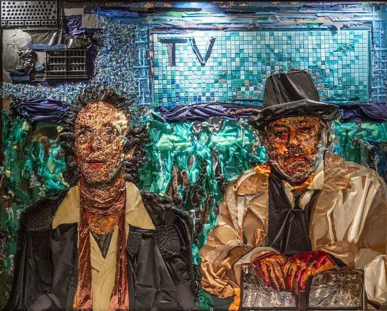 In particolare, i quadri come quattordici fotogrammi rievocano le atmosfere iconiche di alcuni tra i film felliniani che più hanno contribuito a rendere alto l’apprezzamento per la cinematografia italiana nel mondo. Capolavori da premio Oscar come 8½ (1963) e La dolce vita (1960) con un’Anita Ekberg e un Marcello Mastroianni i cui corpi vengono definiti e sagomati da centinaia di tasti di vecchi computer e da ritagli di pelle. Persino il bianco e nero de Lo sceicco Bianco (1952) riceve un’inattesa e potente forza cromatica da fibbie, borchie e tessere a lamina metallica. E poi ancora frame tratti dal primo lungometraggio a colori, Giulietta degli spiriti (1965) e fotogrammi da La strada (1954), Le notti di Cabiria (1957), Satyricon (1969), I clowns (1970), Il casanova (1976), e Ginger e Fred (1985). Non poteva infine mancare l’ultima pellicola di Fellini del 1990, La voce della Luna, ricordata da una scena con Paolo Villaggio e Roberto Benigni.