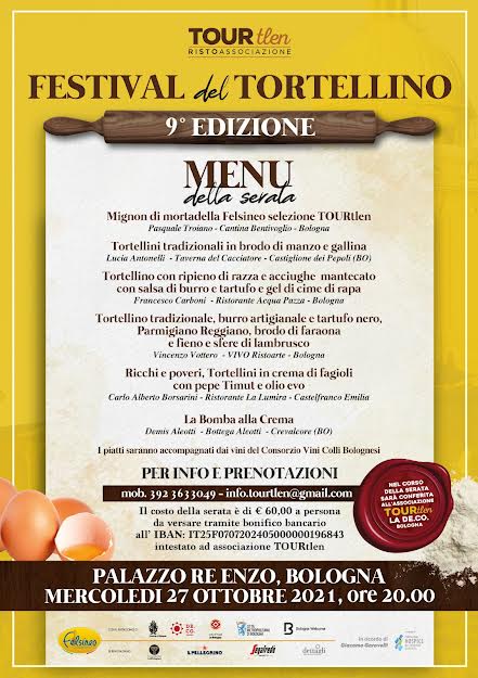 Dopo la sospensione dello scorso anno a causa della pandemia, questa edizione assume la forma di una cena di gala nella quale il tortellino sarà protagonista. L’Associazione tOur-tlen , grazie alla collaborazione con il Comune di Bologna, desidera rimettere il Tortellino al centro dell’attenzione della città rendendogli omaggio con un adeguato servizio al tavolo nella serata in cui gli verrà conferito il riconoscimento De.Co. (Denominazione Comunale). Il riconoscimento sottolinea il lavoro svolto, insieme alla precedente amministrazione, sulle linee guida per la produzione di un tortellino “di filiera” bolognese che mantiene gli ingredienti della ricetta depositata in Camera di Commercio e si adatta alle moderne esigenze di tracciabilità, sostenibilità ed etica. L’intento è pertanto quello di garantire il consumatore promuovendo una ricetta tipica negli ingredienti e nei procedimenti di confezionamento.
