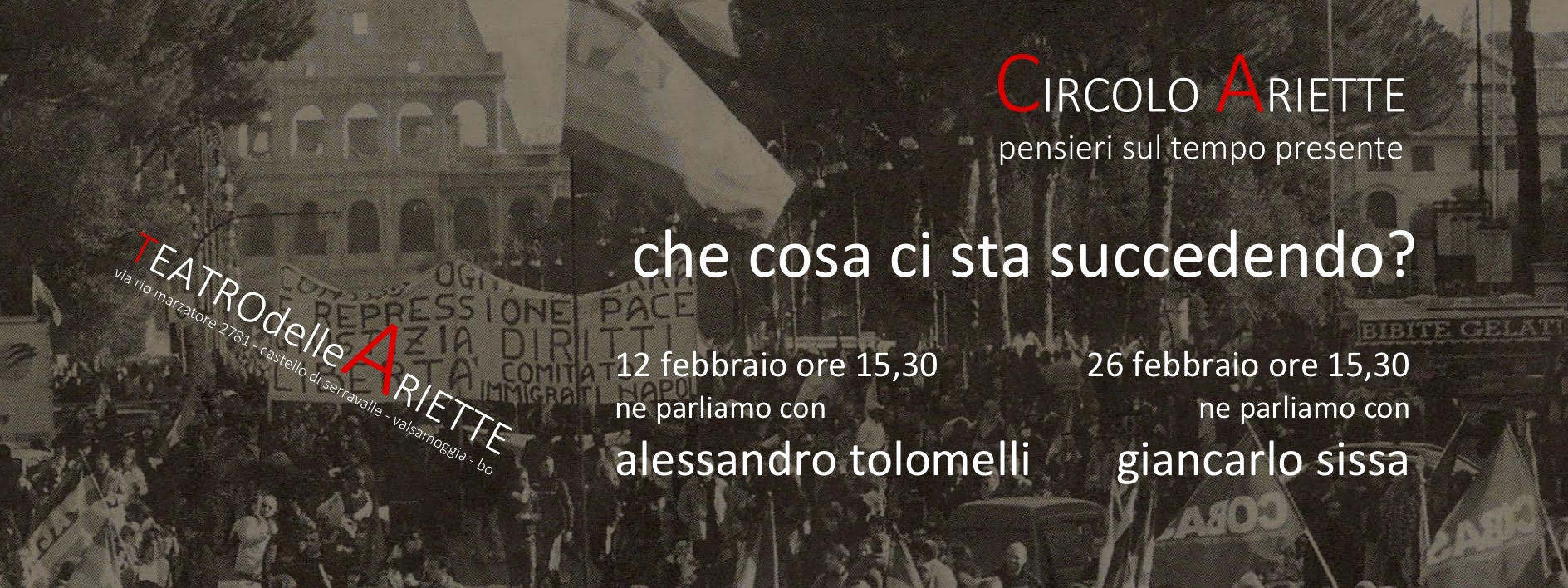 Dal mese di febbraio il Teatro delle Ariette dà vita nel proprio spazio ad un nuovo progetto realizzato con il patrocinio del Comune di Valsamoggia: il CIRCOLO ARIETTE pensieri sul tempo presente, una serie di incontri di riflessione, confronto, elaborazione di idee sulle nostre vite nel tempo presente partendo dalla domanda “Che cosa ci sta succedendo?”. Ogni incontro si avvarrà della partecipazione di amici artisti, studiosi, pensatori appassionati che possano aiutare, dal loro punto di vista, a rispondere a questa domanda.