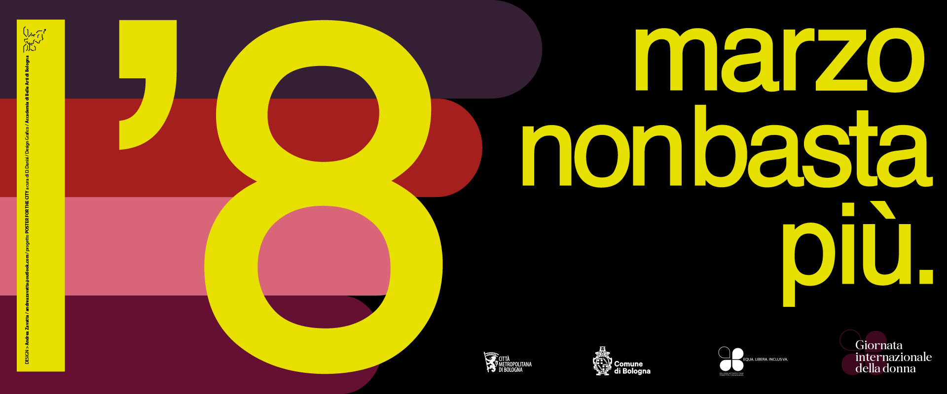 Il manifesto che rappresenta l’8 marzo è stato ideato da Andrea Zavatta, studente del corso di design grafico dell’Accademia di Belle Arti selezionato dal professor Danilo Danisi nell’ambito del progetto Poster for the City. Sono 200 gli appuntamenti del territorio metropolitano raccolti nel calendario dell’8 marzo, che presenta l’insieme delle attività promosse dai 55 Comuni e dalle Associazioni del territorio.