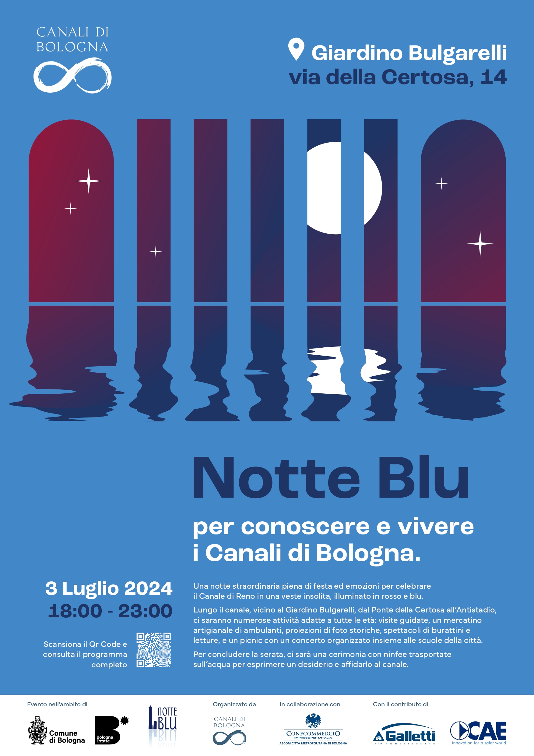 Canali di Bologna è lieto di annunciare la nona edizione della NOTTE BLU, un’iniziativa dedicata alla valorizzazione dei suggestivi canali che attraversano il centro storico della città. Questa serata, pensata per riscoprire e vivere il patrimonio idrico bolognese, avrà luogo mercoledì 03 luglio dalle 18:00 alle 23:00 presso il Giardino Bulgarelli e lungo il percorso ciclo pedonale che costeggia il canale di Reno dal Ponte della Certosa, dietro l’antistadio.