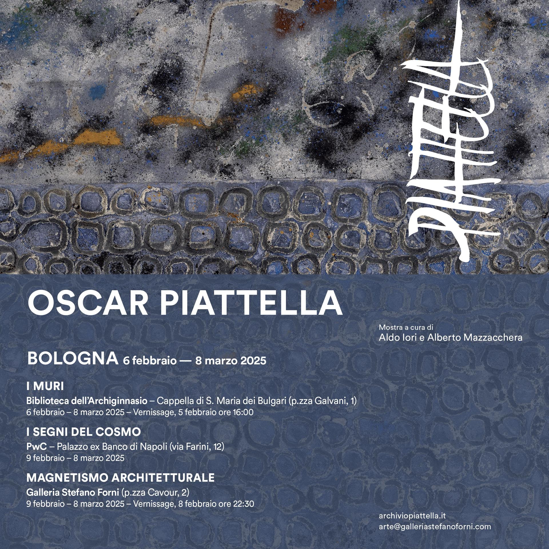 La mostra all’Archiginnasio di Bologna è il primo di tre appuntamenti espositivi pensati per valorizzare l’opera del maestro pesarese in programma nella settimana di ART CITY Bologna ed Arte Fiera. Sabato 8 febbraio apriranno anche le mostre Oscar Piattella. I segni del cosmo presso la sede di PwC Italia in via Carlo Farini 12 (ore 18, solo su invito) e Oscar Piattella. Magnetismo architetturale alla Galleria Stefano Forni, in piazza Cavour 2 (ore 22:30, ingresso libero).