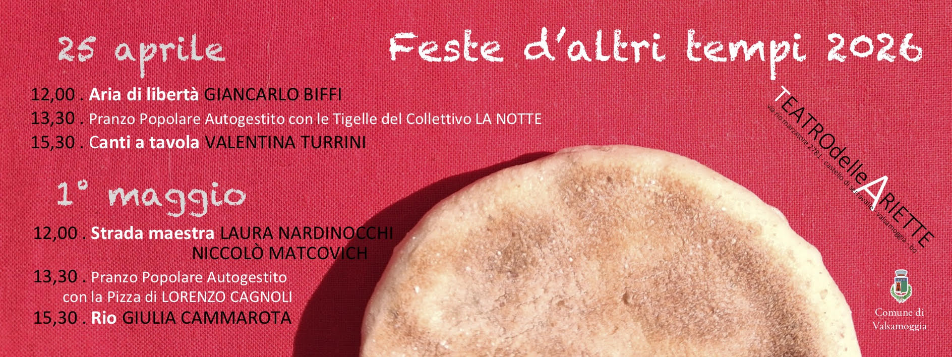 Si annuncia così l’edizione 2026 di Feste d’altri tempi che, in date importanti del calendario civile, il 25 aprile e il 1° maggio, presenta spettacoli e momenti conviviali, con il patrocinio del Comune di Valsamoggia.